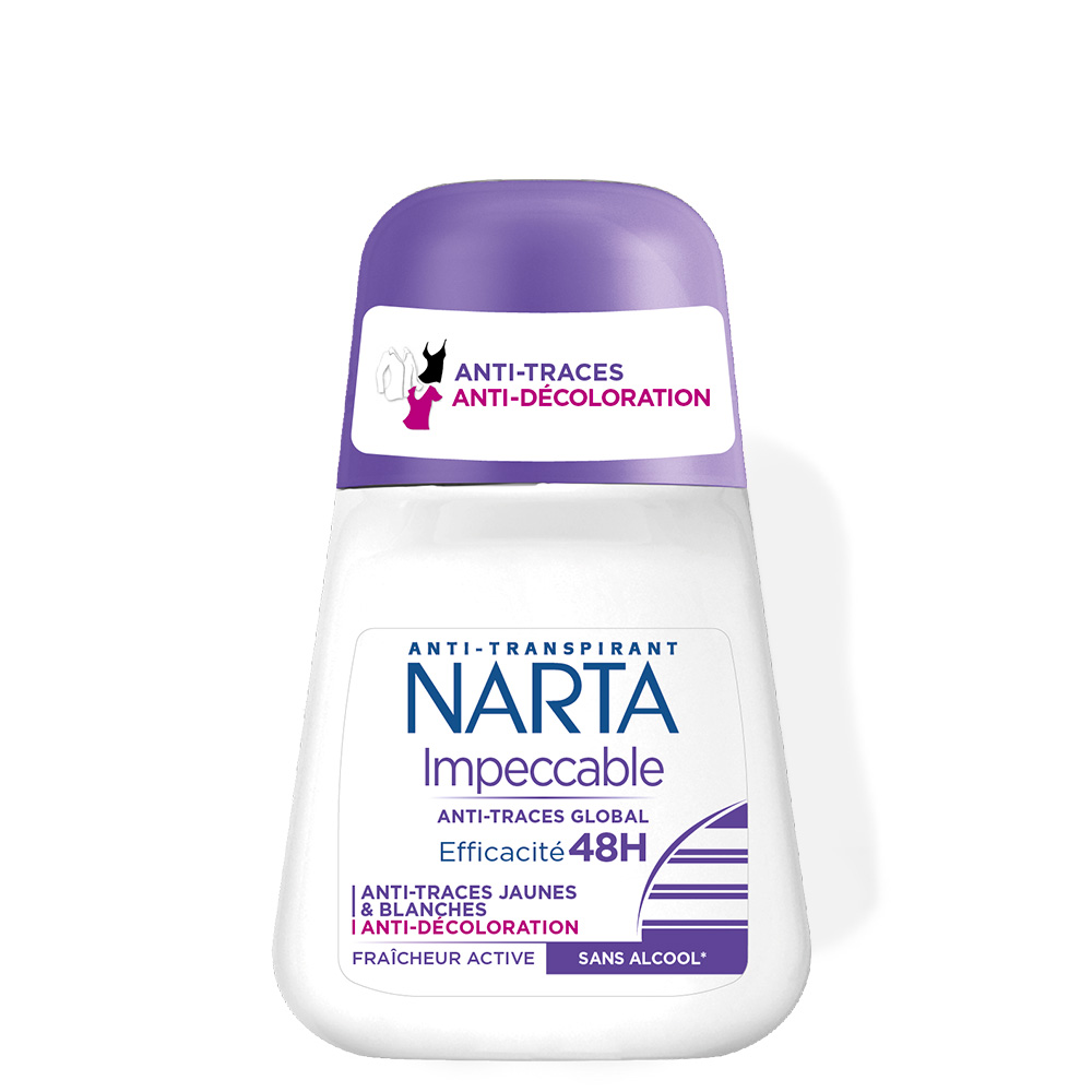 - L'anti-transpirant Narta Impeccable vous procure une action anti-traces globale. Une formule aux actifs invisibles pour vous assurer une protection anti-traces blanches sur les vêtements noirs. Les actifs susceptibles de jaunir les vêtements ont été identifiés et éliminés pour une protection anti-traces jaunes sur les vêtements blancs. Formulé spécifiquement pour réduire le dépôt dans la fibre textile afin de préserver vos vêtements colorés. Il respecte votre peau et le mécanisme naturel de transpiration