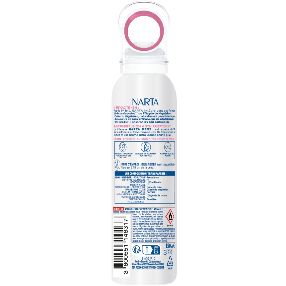- Pour la 1ère fois Narta intègre dans une formule déodorante brevetée de l'Oxyde de Magnésium. Contient du Magnésium, naturellement présent dans la peau. Anti-humidité, il absorbe 2x son poids en eau. Il respecte votre peau et le mécanisme naturel de transpiration. Son nouveau diffuseur Narta Deoz est équipé de 10 micro-diffuseurs révolutionnaires. Ils transforment la formule en une brume ultra douce pour la peau