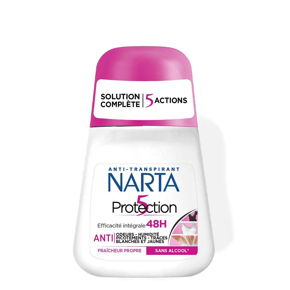 - L'anti-transpirant Narta Protection 5 offre une efficacité en 5 actions, anti-odeurs, anti-humidité, anti-picotements, anti-traces blanches, anti-traces jaunes. Sa fraîcheur propre vous garantit une sensation de bien-être durable. Il respecte votre peau et le mécanisme naturel de transpiration.