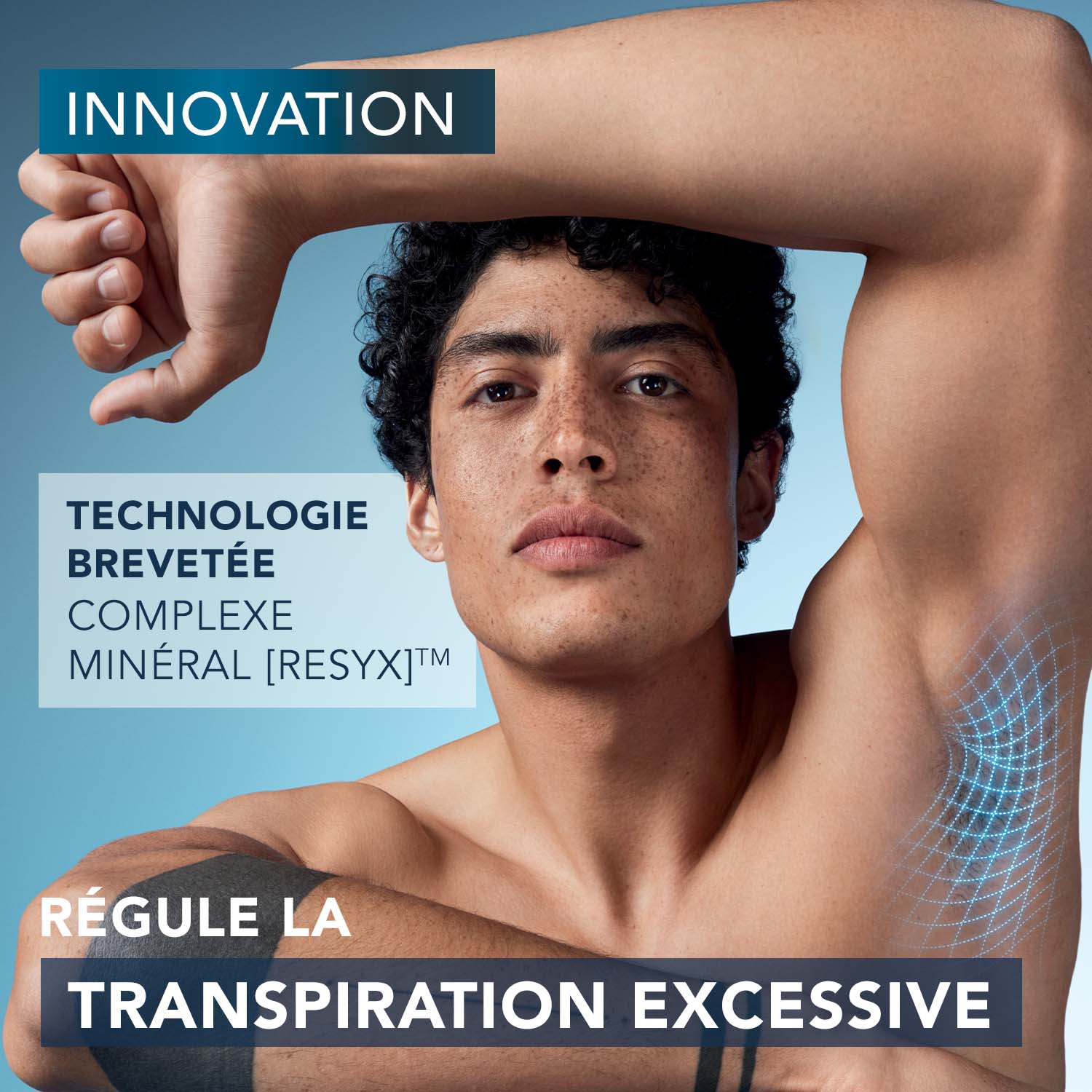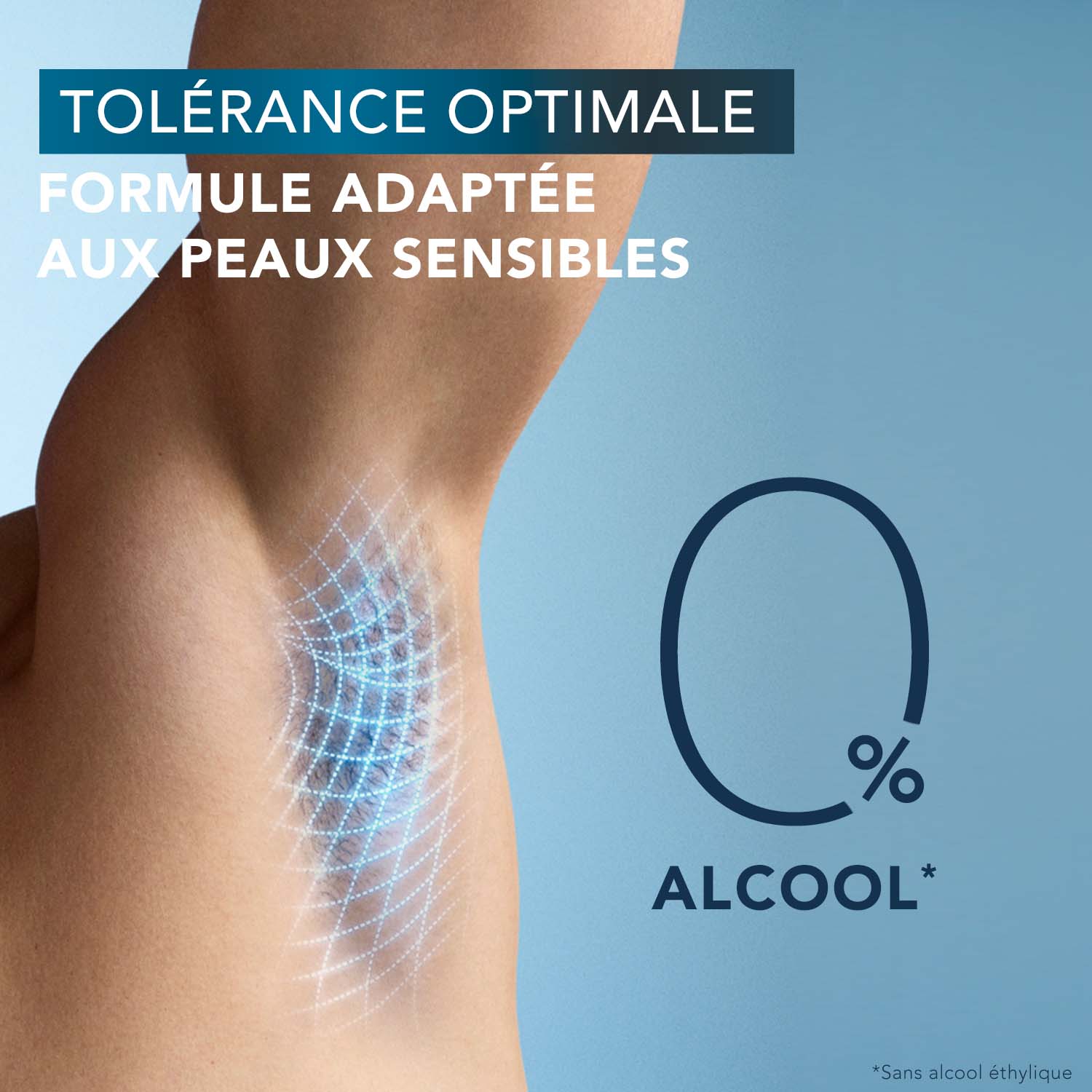 Détranspirant qui régule la transpiration excessive. Formule brevetée, sans alcool*, anti-irritations** et adaptée aux peaux sensibles.
