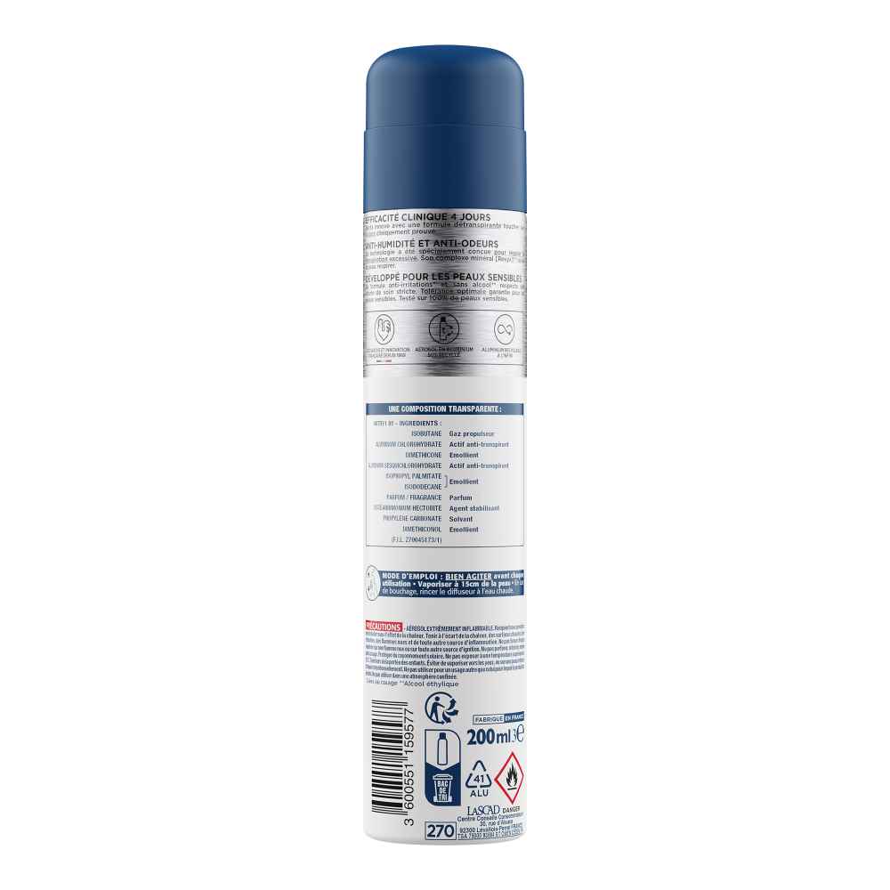 PRÉCAUTIONS - AÉROSOL EXTRÊMEMENT INFLAMMABLE. Récipient sous pression : peut éclater sous l’effet de la chaleur. Tenir à l’écart de la chaleur, des surfaces chaudes, des étincelles, des flammes nues et de toute autre source d’inflammation. Ne pas fumer. Ne pas vaporiser sur une flamme nue ou sur toute autre source d’ignition. Ne pas perforer, ni brûler, même après usage. Protéger du rayonnement solaire. Ne pas exposer à une température supérieure à 50°C. NE PAS EXPOSER DANS UNE VOITURE EN PLEIN SOLEIL, À LA PLAGE OU SUR UN RADIATEUR. TOUT FLACON DÉFORMÉ NE DOIT PLUS ÊTRE UTILISÉ. Tenir hors de la portée des enfants. Ne pas utiliser pour un usage autre que celui pour lequel le produit est destiné. Éviter de vaporiser vers les yeux, ou sur une peau irritée et d'inhaler intentionnellement. Ne pas utiliser dans une atmosphère confinée. - 987511 01 - INGREDIENTS: ISOBUTANE • ALUMINUM CHLOROHYDRATE • DIMETHICONE • ALUMINUM SESQUICHLOROHYDRATE • ISOPROPYL PALMITATE • ISODODECANE • PARFUM / FRAGRANCE • DISTEARDIMONIUM HECTORITE • PROPYLENE CARBONATE • DIMETHICONOL (F.I.L. Z70045173/1). Les listes d’ingrédients entrant dans la composition des produits de notre marque sont régulièrement mises à jour. Avant d’utiliser un produit de notre marque, vous êtes invités à lire la liste d’ingrédients figurant sur son emballage afin de vous assurer que les ingrédients sont adaptés à votre utilisation personnelle