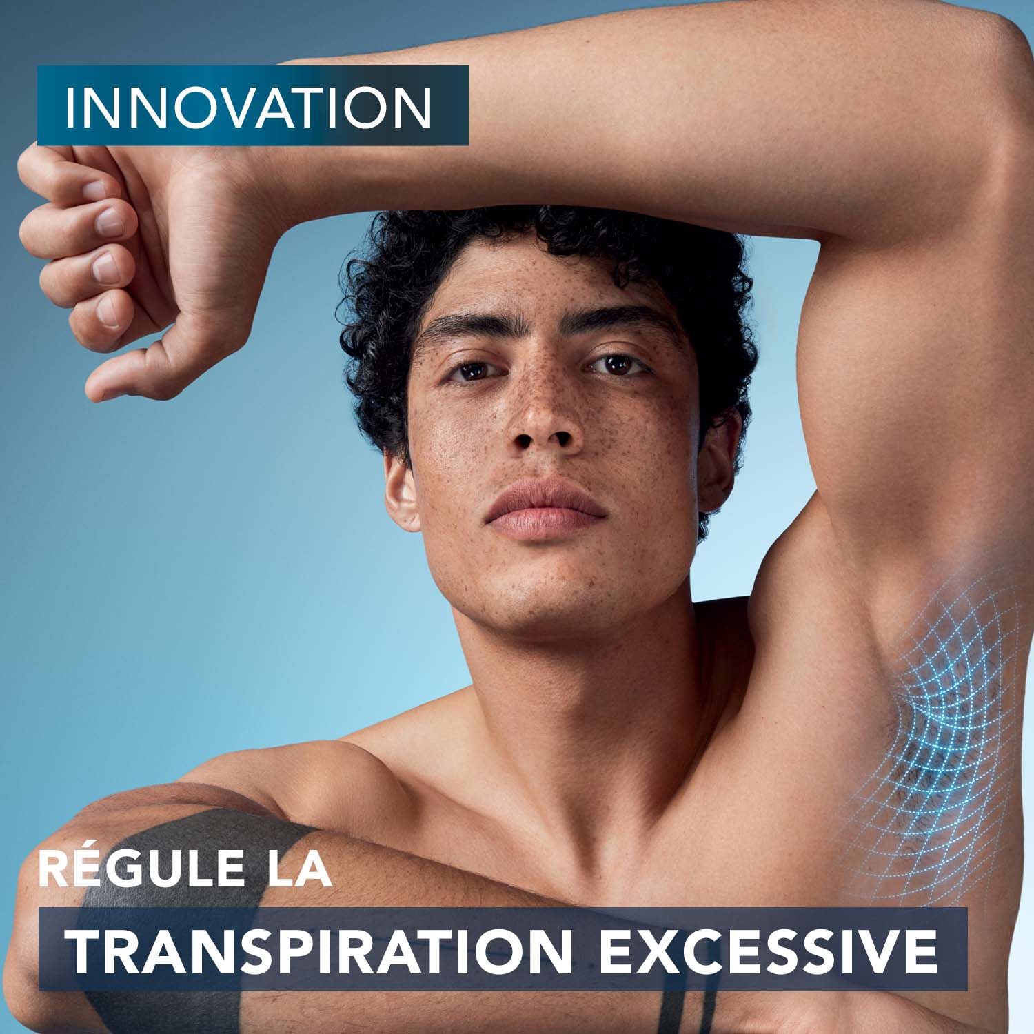 Détranspirant qui régule la transpiration excessive. Sans alcool*, anti-irritations** et adapté aux peaux sensibles.
